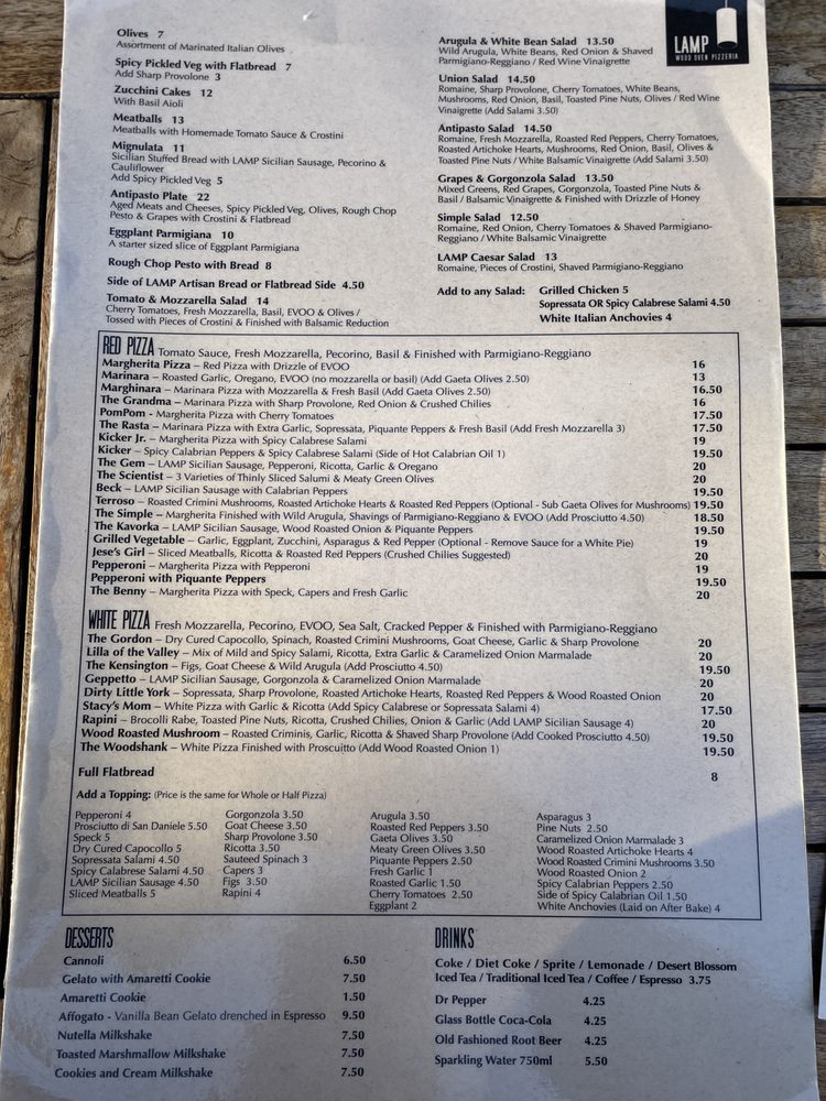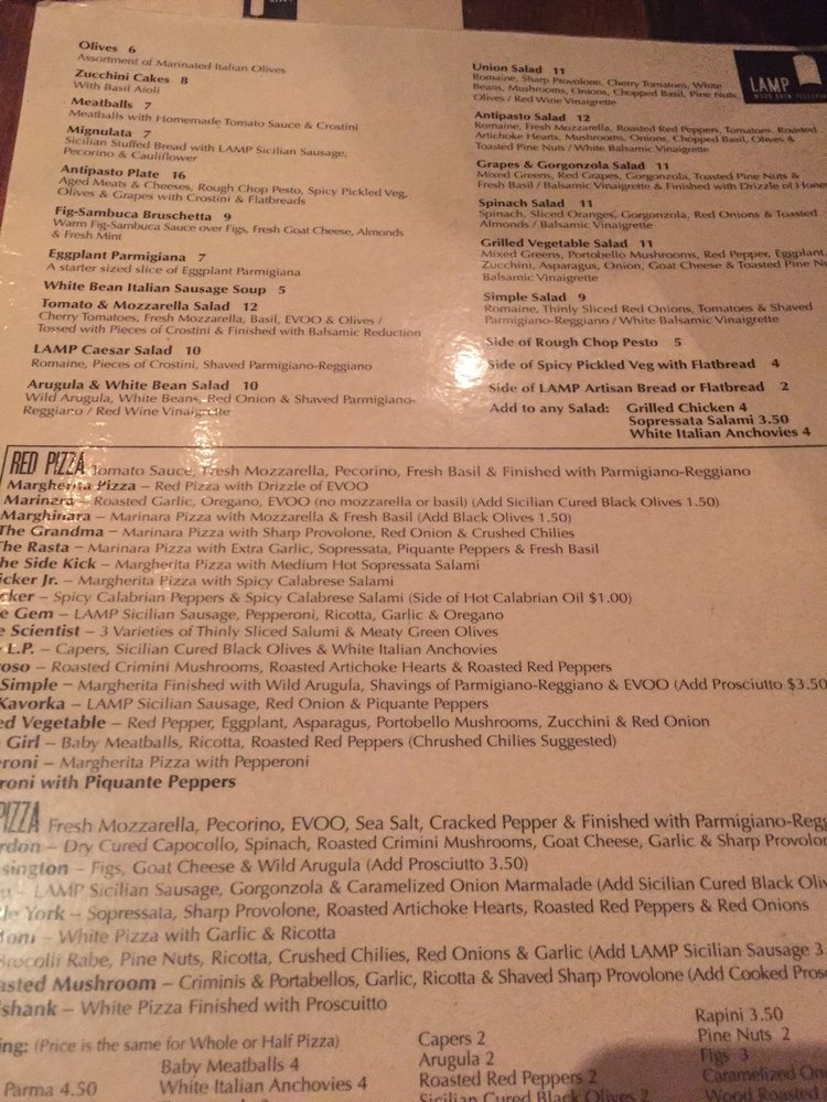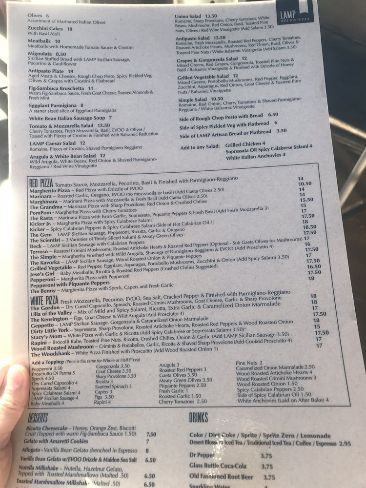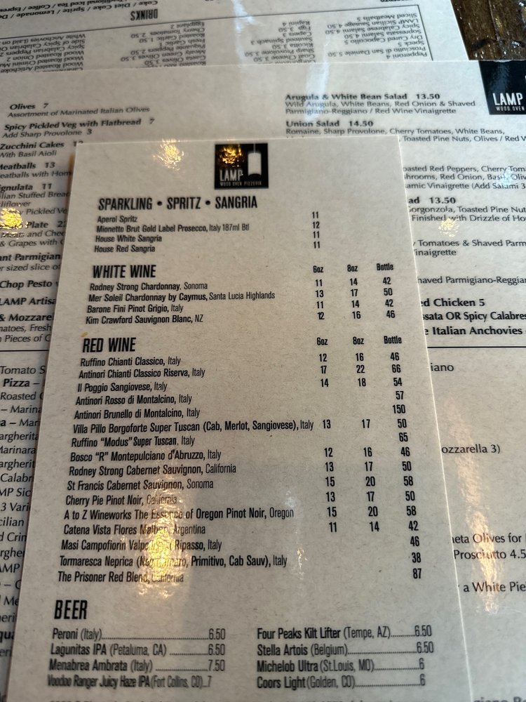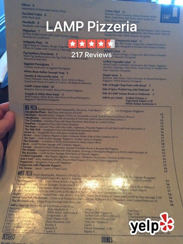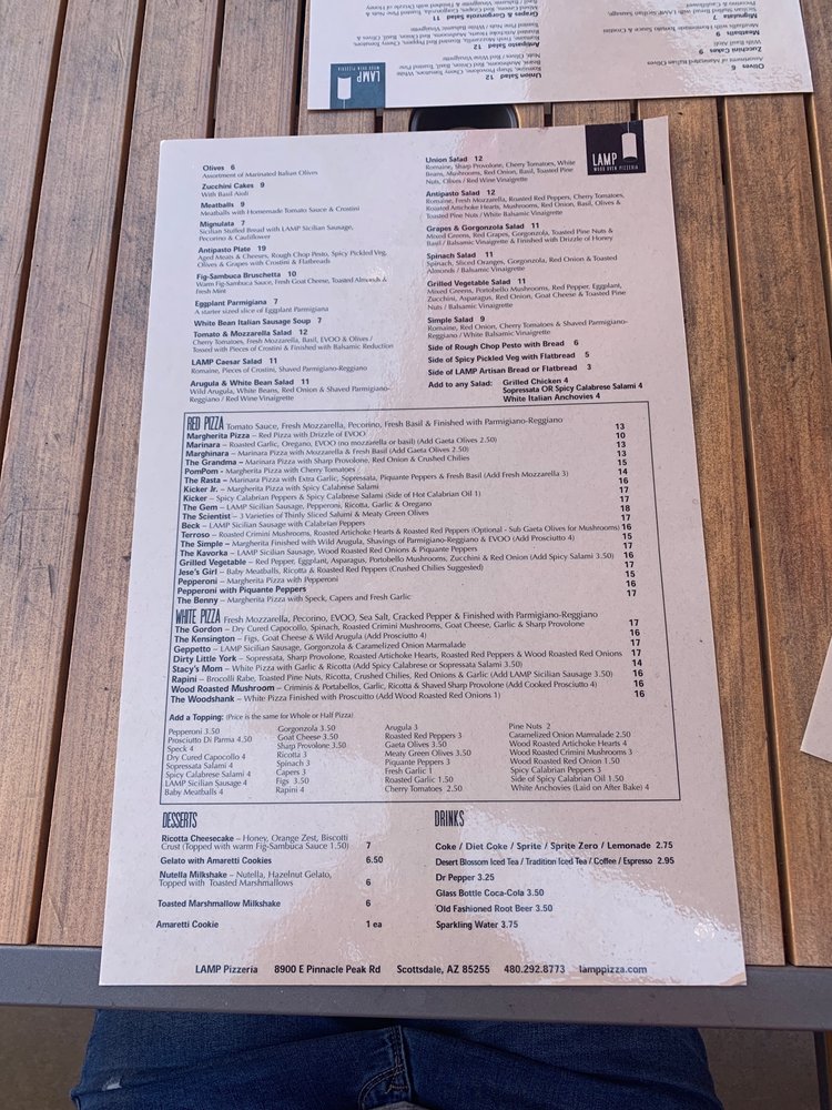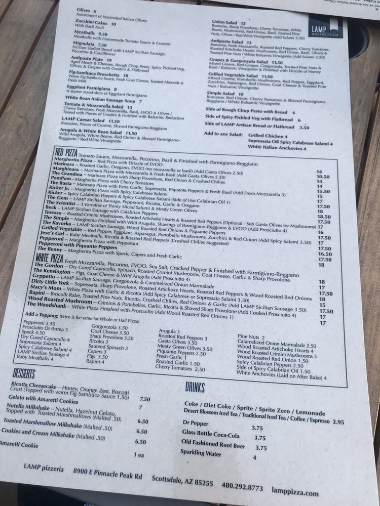LAMP Pizzeria, located in Scottsdale, AZ, offers a cozy and welcoming atmosphere with top-notch service. Specializing in wood-fired pizzas, their menu boasts a variety of options to cater to all preferences, including vegan and vegetarian choices. Standout dishes include the PomPom Margherita Pizza and the Geppetto Lamp Sicilian Sausage White Pizza. Customers rave about the quality of the dough, perfectly balanced toppings, and flavorful salads. The dedication to using fresh ingredients and attention to detail shines through in every bite. Make sure to try the Kicker Junior Caesar salad and save room for the indulgent toasted marshmallow milkshake. Whether dining in or taking out, LAMP Pizzeria delivers a memorable and delicious experience that will keep you coming back for more.